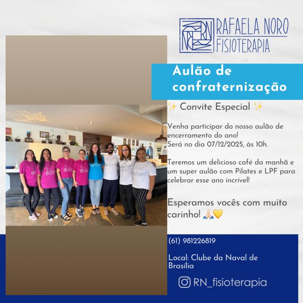 O Clube Naval de Brasília receberá no dia 7 de dezembro, às 10h, o aulão de confraternização de encerramento de ano promovido pela Rafaela Noro Fisioterapia. Um encontro que une o cuidado com o corpo à essência do que torna nossa vida verdadeiramente plena: a conexão com pessoas que compartilham propósitos semelhantes.