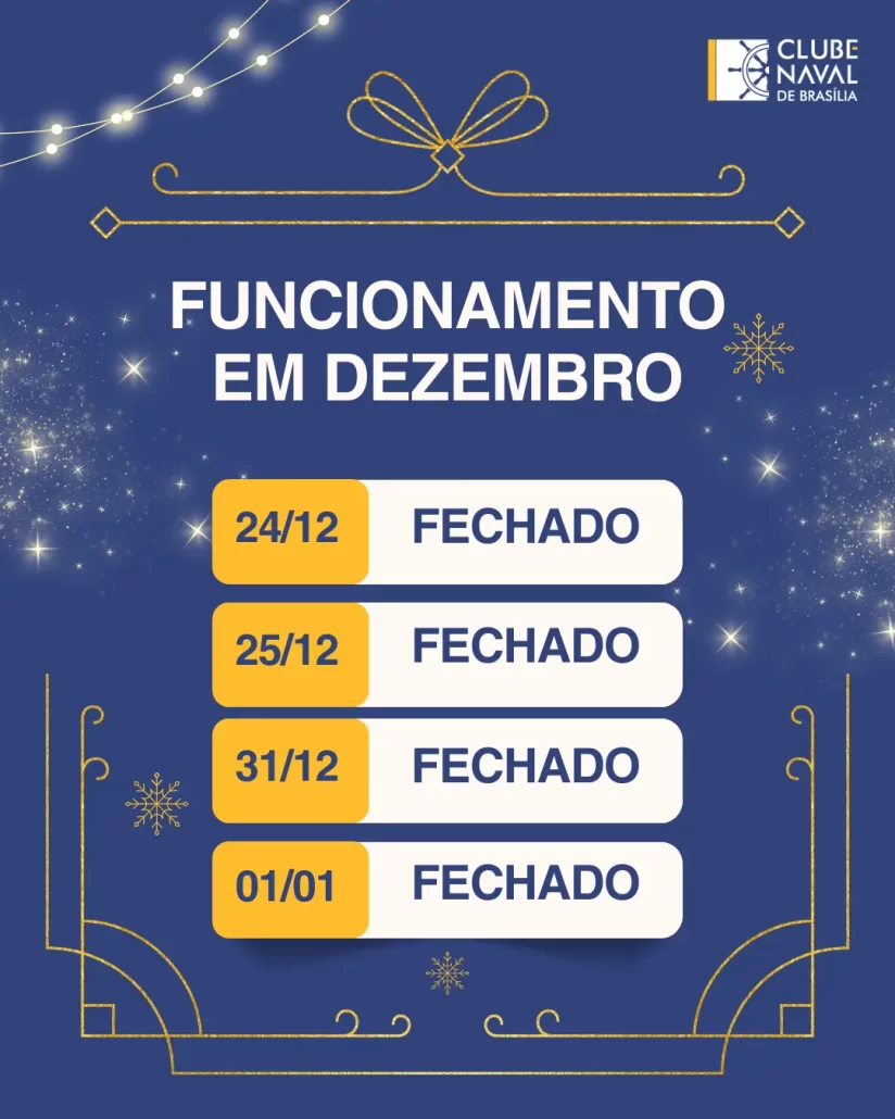 As celebrações de fim de ano se aproximam, trazendo consigo momentos de reflexão, gratidão e renovação. Para que você possa planejar seus dias ao lado de quem mais importa, informamos os dias de funcionamento do Clube Naval de Brasília durante este período especial.
